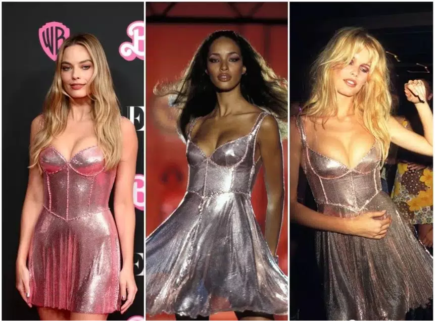 Of course, Robbie's vintage-inspired looks don't stop at the '90s. This Herve Leger striped mini dress was custom-made, drawing inspiration from the first Barbie doll from 1959.