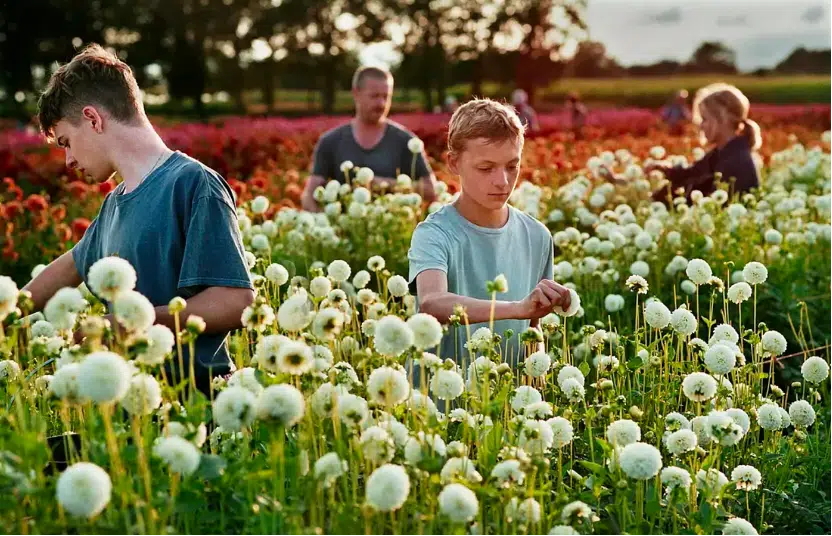 There is a clear dividing line within the film, distinctly separating its focus and tone. In the first 45 minutes, we see the fairy-tale pure friendship between the two protagonists, Leo and Remi. A kind of intimacy very common among teenage girls but rare among boys. During the day, they build imaginary kingdoms, share secret fortresses, and play and wander through the dahlia fields managed by Leo's family. At night, they sleep in each other's arms, a simple reliance as if their dreams were holding hands.