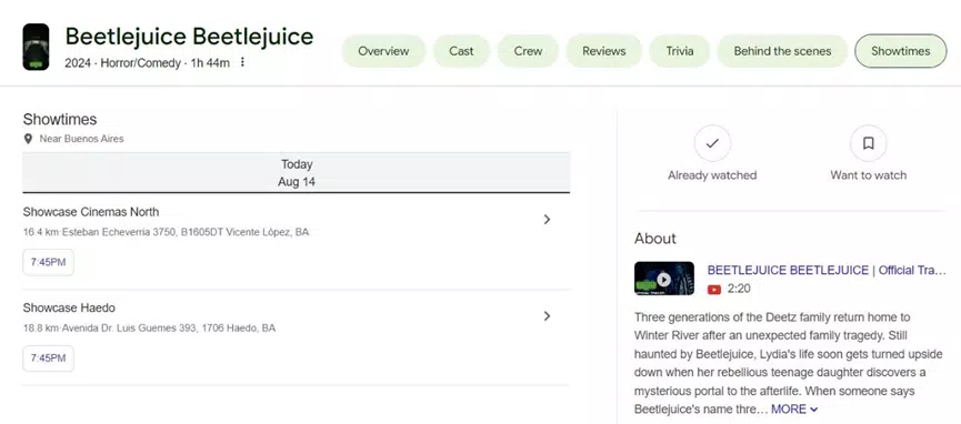 It was airing in Showcase Cinema North and Showcase Haedo at 7.45 pm. This can't be! I know that it's set to premiere at this year's Venice Film Festival on August 28, followed by a U.S. theatrical release starting September 6. Could it be that this new film has some special connection with Argentina, allowing it to have a limited screening in Buenos Aires long before the official release? The Google search results page showed that this film's runtime is 104 minutes, which matches the information on Wikipedia and Peliplat. After clicking the ticket purchase link, I landed on the corresponding cinema's website but was directed to the original 1988 "Beetlejuice," with a runtime of 92 minutes. Now I know for sure—this is a mistake on the theatre's part. If it's intentional, perhaps they're trying to cash in on those eager to see the new version.