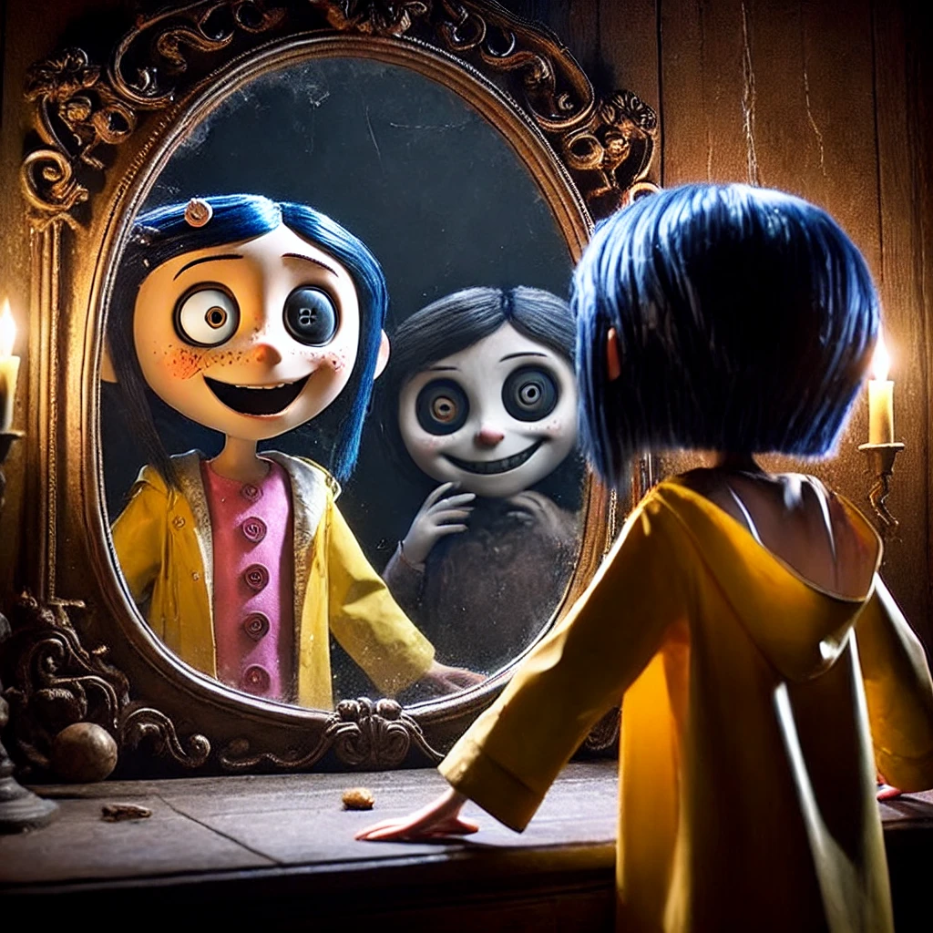 continúa con sus rutinas pero las cosas extrañas no dejan de pasar y ahora mientras caminaba en el pasillo frente al espejo ella noto que su reflejo de detuvo a comparación de ella y comenzo a sonreir de forma Maligna y con sus Ojos De Botón.