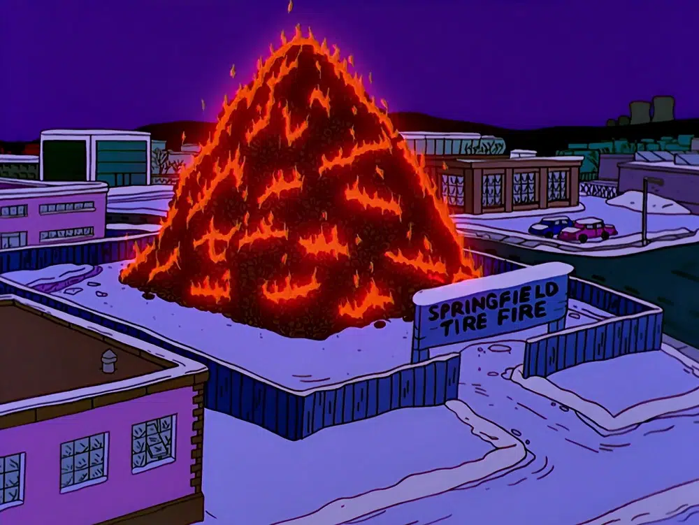 I turn a corner and am met by the Springfield Tire Fire. Since childhood, I've desired to gaze upon this burning heap of rubber. Its pungent, unpleasant aroma fills my being, reminding me of car wrecks and gas stations. This mountain of orange and red flames raises my body temperature to uncomfortable levels. The heat becomes unbearable, so I walk on.