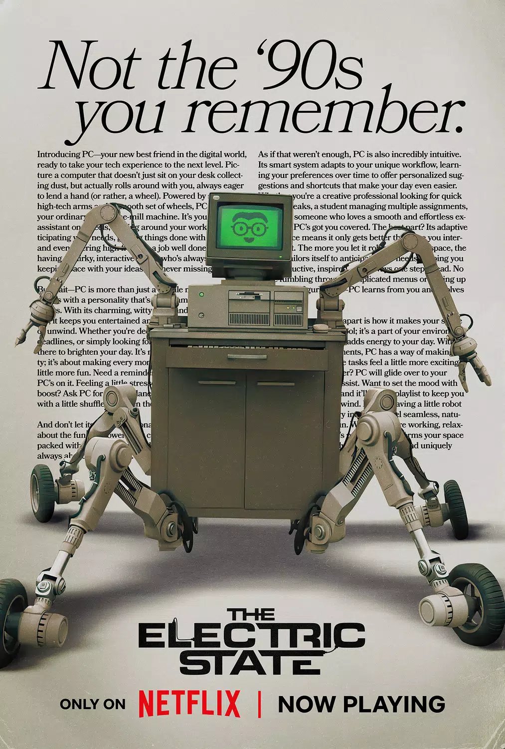 The Electric State feels more like a reimagining of the original work than a direct adaptation. While it maintains the core premise—the Sentre company corrupts humanity with virtual reality headsets after helping defeat AI—the film takes significant creative liberties. The art design faithfully reproduces several characters while introducing compelling new ones (see images at the end). The difference is that the Russo brothers made a bold choice to transform the original's tragic tone into outright comedy—a decision that has alienated many devoted fans of the source material. They've added new comedic characters and interspersed humorous scenes between plot points. As a result, the original's overwhelming sense of despair and civilizational collapse has largely disappeared. Even the few faithful recreations of Sentre-mummified humans lose their impact amid the comedic elements. Similarly, the central road trip storyline has shifted from Michelle and her brother Christopher's desperate journey to an optimistic quest to save the world.