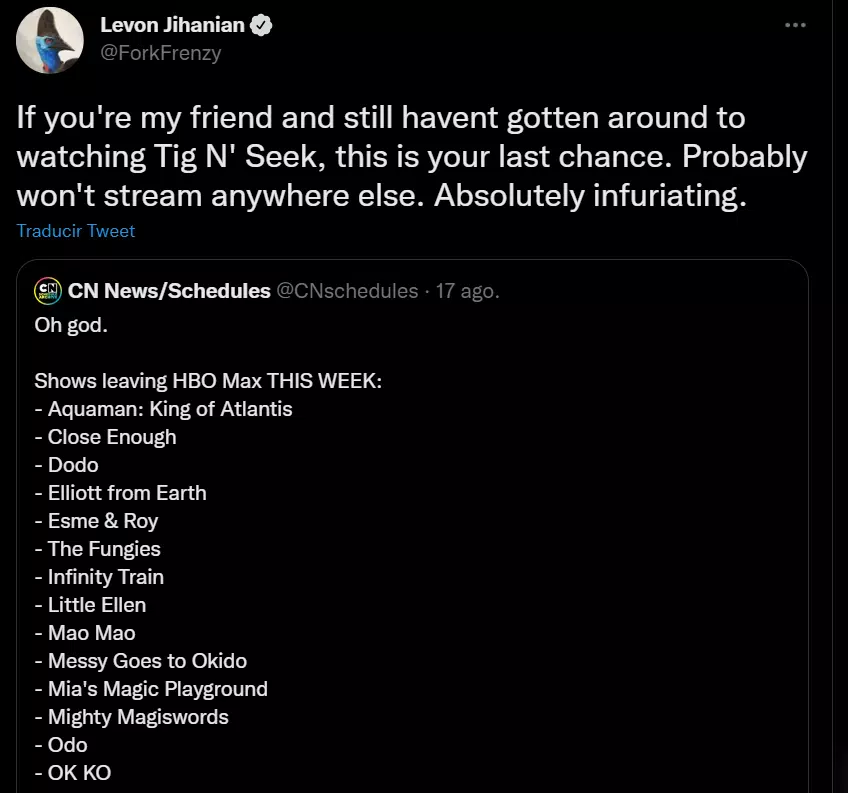 Quizás lo más desolador es que muchos de los originales de HBO Max no tendrán vida después de que se eliminen de la plataforma. La idea de que Warner Bros. Discovery permita que uno de sus competidores reviva un programa como "Tig n' Seek", "Infinity Train" o "Close Enough" es poco probable.