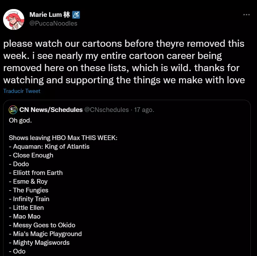 Marie Lum, artista de storyboard y revisionista de "Aquaman: King of Atlantis" e "Infinity Train", tuiteó "miren nuestros dibujos animados antes de que [los] eliminen esta semana. Ver que casi toda mi carrera en animación se eliminará aquí en estas listas , es salvaje". Terminó su publicación con un mensaje sincero: "gracias por mirar y apoyar las cosas que hacemos con amor".
