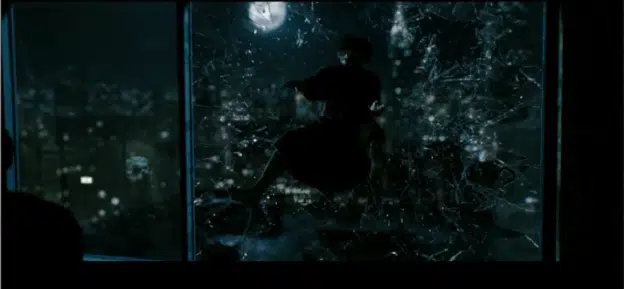 Después de que El Comediante rompe la puerta, la cámara lenta hecha a propósito no se utiliza para alardear, sino que destaca la velocidad del asesino, por el contrario. Él está parado en la entrada cuando el asesino irrumpe. Cuando El Comediante arroja el vaso, el asesino lo esquiva, luego lo atrapa y lo estrella contra la puerta de la habitación 3001. El Comediante rueda y levanta su pistola mientras el asesino llega al otro lado de la TV y controla a El Comediante.