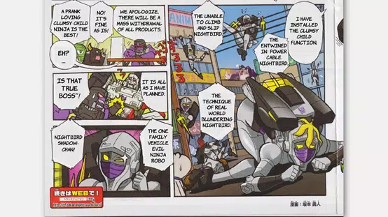Nightbird fue creada por el Dr. Fujiyama, un científico japonés, pero pronto Galvatron la robó y la modificó para que pueda ser miembro de los Decepticoins. En su primera misión, Nightbird demuestra sus habilidades extraordinarias y se enfrenta fácilmente a varios Autobots. Incluso Blackarachnia la alaba, lo que nos lleva al siguiente diálogo: