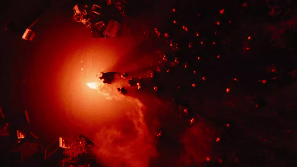 En la escena final donde Batman salta del agua con una bengala, el lugar luce como un infierno. Él trae luz a la oscuridad, pero su presencia no mejora la situación. Solo puede impedir que todo empeore.