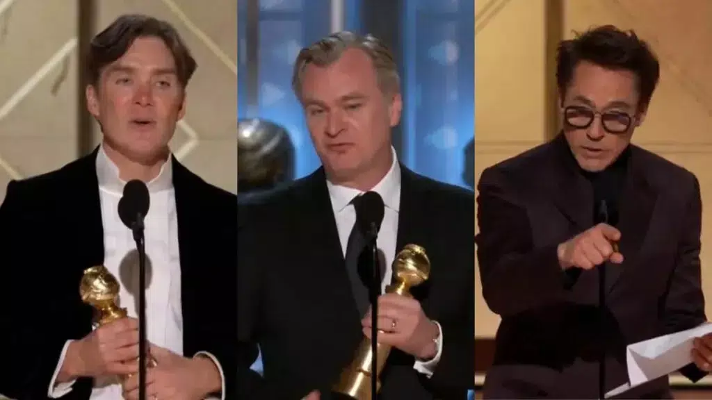 El director Christopher Nolan ganó por primera vez el Globo de Oro y, en su discurso, mencionó emocionado que la última vez que pisó el escenario del Globo de Oro fue para aceptar el premio al Mejor Actor de Reparto en nombre del inolvidable Heath Ledger. "La mirada de Robert Downey Jr. esa vez me llamó la atención. Estaba llena de atención y apoyo. Es la misma mirada que expresa ahora. La misma atención y apoyo que ha mostrado a tantas personas en nuestra comunidad a lo largo de los años", reveló el director. Downey reaccionó al discurso con lágrimas en los ojos y el público aplaudió.