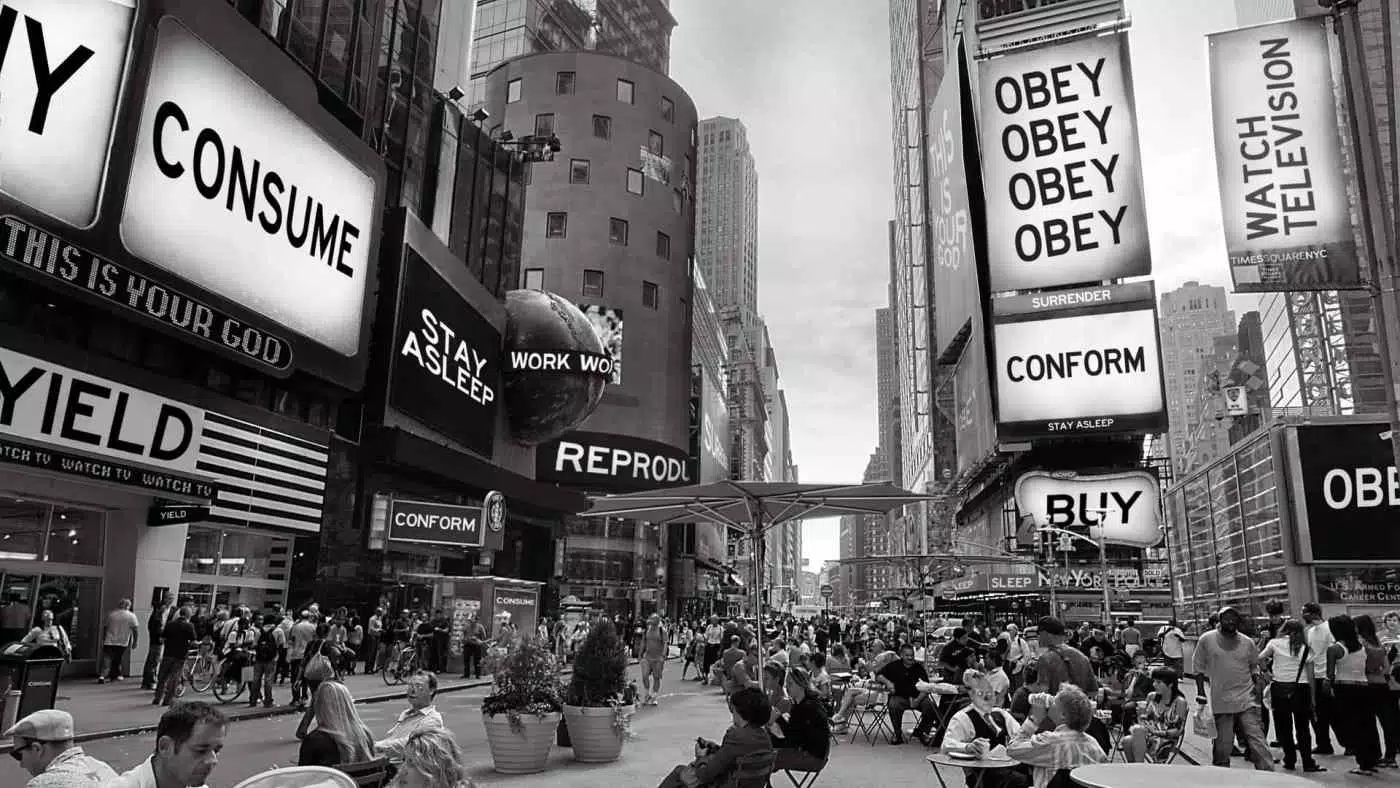 No hay escapatoria, incluso los espacios sagrados como el hogar o los lugares de ocio están invadidos de mensajes, y las extrañas criaturas que manejan este sistema son indistinguibles de los humanos comunes. Se mueven con comodidad por la ciudad sabiendo que el 99% de la población es completamente ingenua a la dominación que se ejerce sobre ellos.