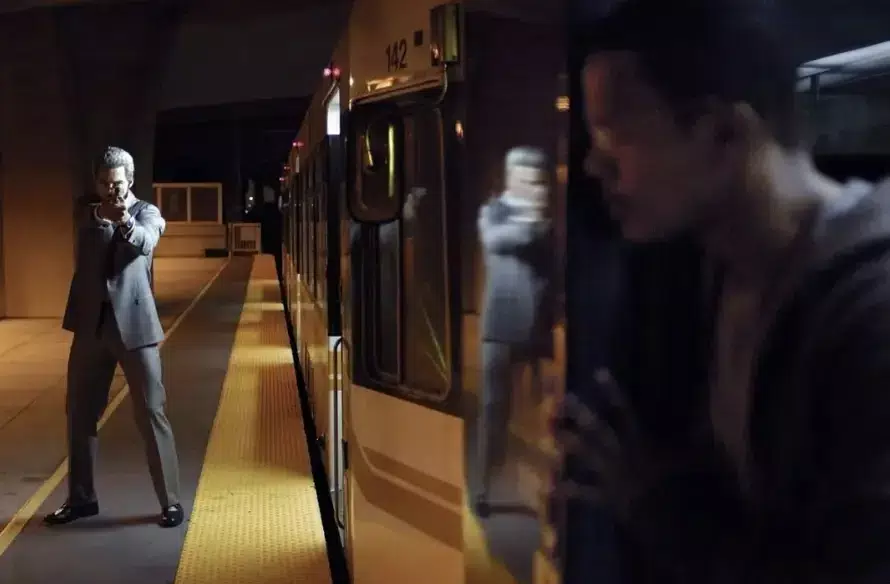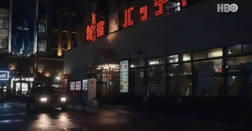 El primer encuentro formal entre Jake y Hiroto Katagiri, interpretado por Ken Watanabe, se captura desde la distancia en la calle mientras se miran a los ojos, entendiéndose en silencio en medio del paisaje urbano.