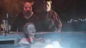 Nuestros animalitos antropomórficos favoritos, ya bastante creciditos, tienen una excusa más que valedera para convertirse en salvajes asesinos del bosque, pero ¿cómo continúa esta historia? Bueno, aquí la cosa se vuelve algo genérica pero que todo fan del cine slayer sabe, acepta y me atrevo a decir que hasta casi lo espera. Tenemos un grupo genérico de jóvenes hermosas que deciden pasar un fin de semana aisladas de la civilización en una casita cerca del bosque, cada una con una característica que la distingue de las otras cayendo en los estereotipos de personajes femeninos: la inteligente, la tonta, la parejita y la final girl. No son personajes que se destaquen demasiado más que para ser carne de cañón en las violentas matanzas como la primera muerte a manos de Pooh en el bosque con una clásica persecución hasta llegar a un taller mecánico donde despedaza a la joven o Pigglet devorando el rostro de una de las chicas en el suelo inundando la escena con sus gritos de sufrimiento. Pero lo verdaderamente interesante aparece cuando nos enteramos como espectadores que Pooh y Pigglet han secuestrado a Christopher Robin para devolverle el sufrimiento que ellos atravesaron tras su partida después de que este regresara al bosque. Y por supuesto que hay flashbacks que atormentan y confunden a Pooh cuando su viejo amigo ruega que se detenga apelando al lazo de amistad que solía unirlos. ¡Qué dramón!