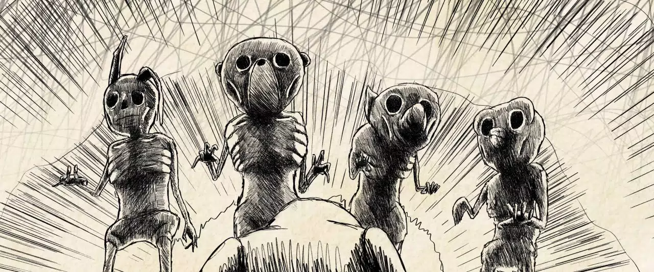 Cuando Christopher Robin aparece para ganarse la confianza de los animales del bosque la animación se desarrolla sobre un fondo cálido casi como un viejo papel y nos transmite una sensación de confort, justo la misma que sienten Pooh, Pigglet, Igor, Búho y Conejo. La voz del narrador es suave y amistosa, nos invita a adentrarnos a un mundo lleno de bondad y amistad. Pero conforme el tiempo pasa y Christopher Robin crece, éste abandona a sus amigos del bosque para ingresar a la universidad, dejándolos a su suerte, ya que ellos mismos no eran capaces de sobrevivir por su cuenta. La comida era llevada por el pequeño humano, que ahora en un acto de egoísmo, los condenaba a morir de hambre en el crudo invierno del bosque. Ahora la animación se desarrolla sobre un fondo igualmente claro pero esta vez la sensación de calidez desaparece y es reemplazada por un frío blanco azulado: nos prepara para la atrocidad que se avecina. La voz del narrador se vuelve cada vez mas tétrica y no es para menos. Nuestros amigos antropomórficos están atravesando la crueldad del desamparo, la comida comienza a escasear y el crudo frío comienza a congelar sus huesos. Las líneas negras invaden los planos de forma violenta, la oscuridad empieza a hacerse presente y el aislamiento de los animalitos en la cueva mientras sus cuerpos van perdiendo peso nos acongoja. Finalmente en medio de una tormenta que no hace más que acentuar el terror de lo que se avecina, Pooh, Pigglet, Conejo y Búho gira hacia el pobre Igor, acorralándolo en el plano a través de líneas que invaden el cuadro y anunciando su pronta muerte a manos de sus propios amigos que sin otro remedio y más conducidos por su instinto primitivo como lo es el hambre que por el pensamiento, avanzan hacia él decididos a saciar su apetito a costa de la vida del pequeño burro.