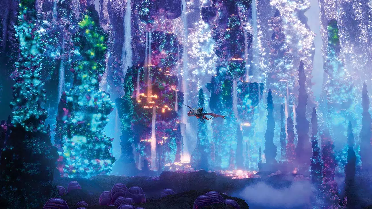 El Mundo Oculto es un lugar inexplicable en palabras, pues no solamente es precioso y mágico, es total y completamente perfecto. No he logrado encontrar un lugar en este mundo que se asemeje a este y es, en cierta forma, curioso. El porqué es debido a que, quizá, en algún momento existió algo similar en nuestro mundo. Y es que en este paisaje no solo vemos colores por montones, vemos formas variadas !que si existen aquí! Si es verdad que hay flores, plantas, rocas, arboles y demás de texturas y colores diferentes a los que conocemos, pero hace miles de años nuestro mundo fue muy diferente. Hoy en día solo en sueños podríamos encontrar algo así en este mundo y es eso lo que hace de este universo, creado para esta historia, algo sobresaliente sobre los demás. Algo que está por encima de otros paisajes cinematográficos.