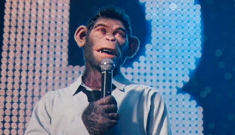 El film arranca con la voz en off del Robbie Williams real diciéndonos: “quiero mostrarles cómo realmente me veo a mí mismo”, y en la siguiente escena vemos a un simio. Esa es la presentación física de nuestro protagonista y no habrá nunca una explicación racional al respecto, porque ya está todo dicho. Y no pasarán más de un par de escenas para que deje de parecernos extraño, así como hacia el final estemos absolutamente convencidos que ese simio que habla, canta, baila, ríe y llora es un ser vivo frente a nuestros ojos.